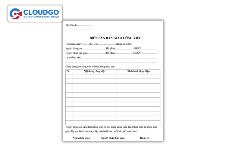 Biên bản bàn giao công việc không chỉ là thủ tục hành chính mà là công cụ quan trọng giúp doanh nghiệp SME đảm bảo tính minh bạch, tránh gián đoạn và giảm thiểu rủi ro khi có sự thay đổi nhân sự hay trách nhiệm công việc. Thông qua việc hiểu đúng khái niệm, nắm rõ nội dung cần có, lựa chọn mẫu phù hợp và thực hiện quy trình bàn giao bài bản, doanh nghiệp có thể chuẩn hóa quản trị và vận hành hiệu quả hơn. Nếu bạn muốn tối ưu toàn bộ quy trình bàn giao và quản lý công việc trên một nền tảng số thống nhất, các giải pháp từ CloudGO sẽ là bước tiếp theo đáng cân nhắc.