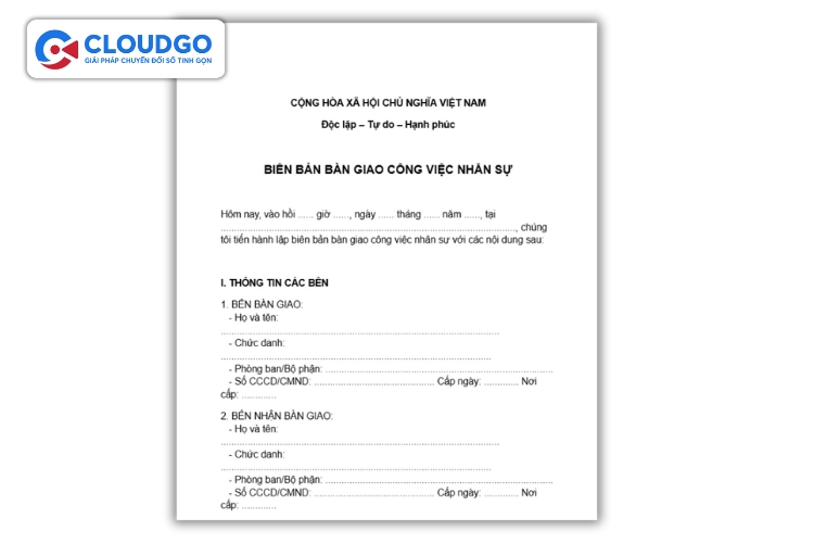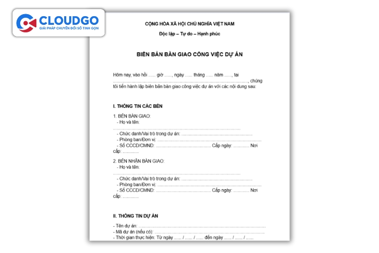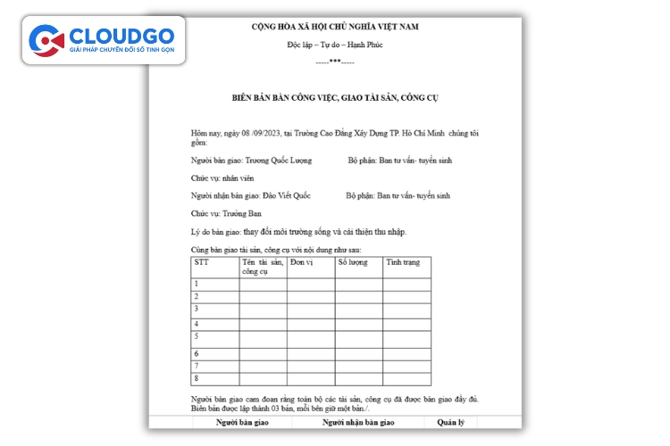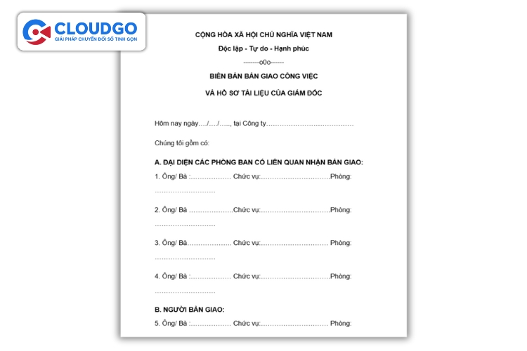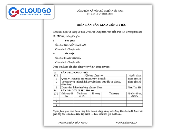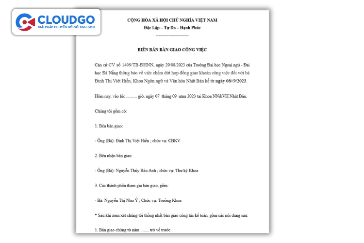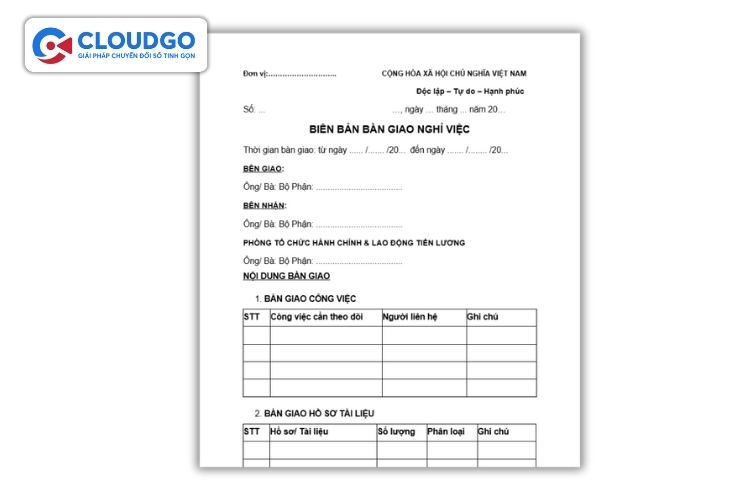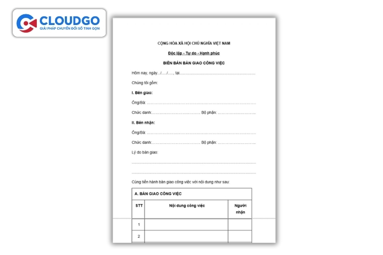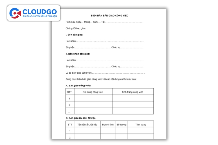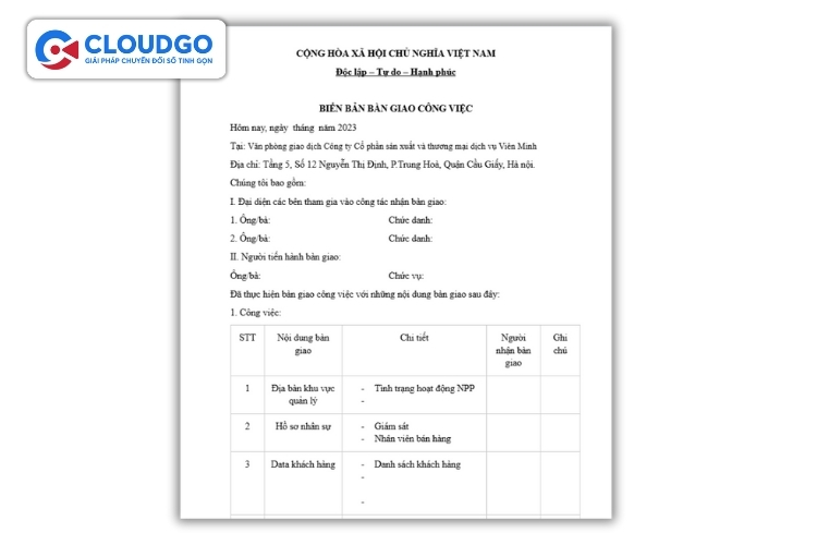 Nắm vững các nội dung cốt lõi này sẽ giúp bạn xây dựng một biên bản hoàn chỉnh, tránh bỏ sót thông tin quan trọng. Để tiết kiệm thời gian và đảm bảo tính chuẩn hóa, CloudGO đã tổng hợp 12 mẫu biên bản bàn giao công việc thông dụng nhất, sẵn sàng cho bạn tải về và sử dụng ngay.