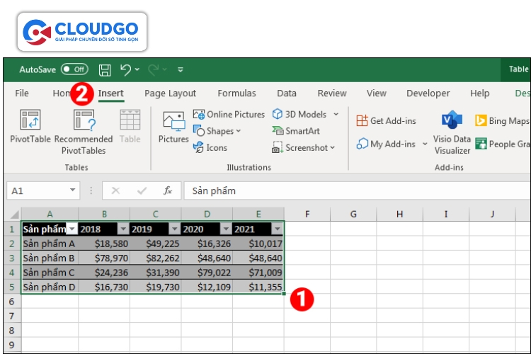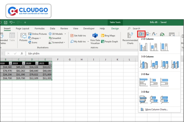 Trên thanh công cụ, chọn tab "Insert" (Chèn),sau đó chọn loại biểu đồ phù hợp với mục đích phân tích của bạn trong nhóm "Charts" (Biểu đồ). Ví dụ: "Column" (Cột) cho biểu đồ cột, "Pie" (Tròn) cho biểu đồ tròn. Excel sẽ tự động tạo một biểu đồ cơ bản từ dữ liệu bạn đã chọn.