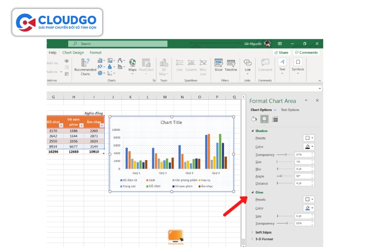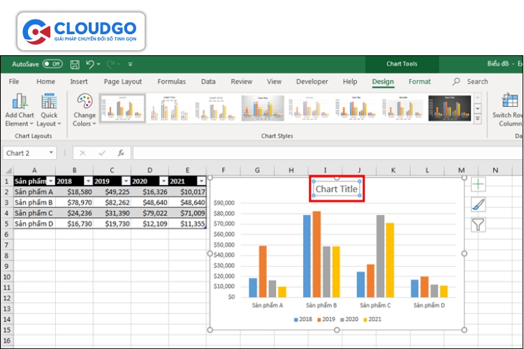 Sau khi biểu đồ được tạo, bạn có thể click vào biểu đồ để hiển thị các công cụ "Chart Design" (Thiết kế Biểu đồ) và "Format" (Định dạng). Tại đây, bạn có thể thay đổi bố cục, kiểu dáng, màu sắc, thêm tiêu đề biểu đồ, nhãn trục, chú giải…