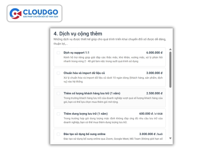- Hỗ trợ khởi tạo hệ thống: Đội ngũ chuyên gia CloudGO sẽ đồng hành trong việc cấu hình ban đầu, đảm bảo hệ thống hoạt động trơn tru.