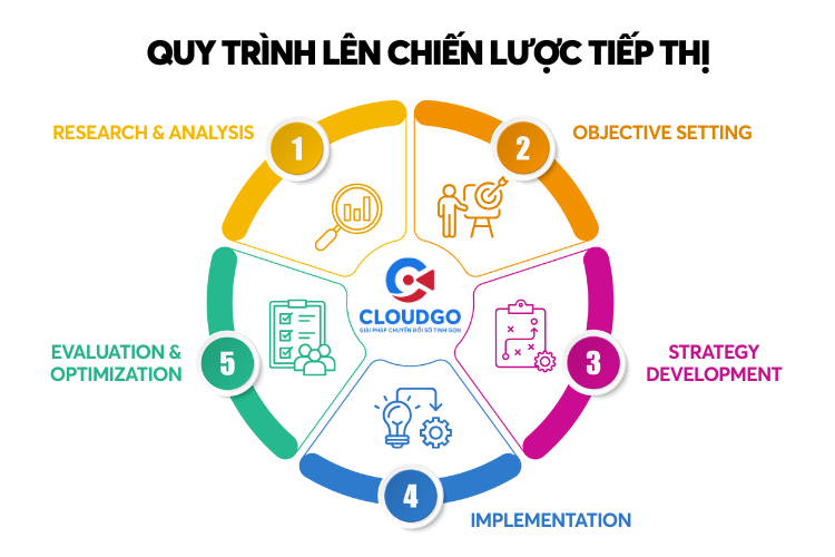 Để xây dựng một chiến lược tiếp thị thành công, phòng Marketing không thể dựa vào cảm tính. Quá trình này đòi hỏi sự phân tích kỹ lưỡng, xác định mục tiêu rõ ràng và một lộ trình thực thi có hệ thống. Dưới đây là quy trình 5 bước nền tảng giúp doanh nghiệp triển khai chiến lược tiếp thị một cách hiệu quả và thực tế.
