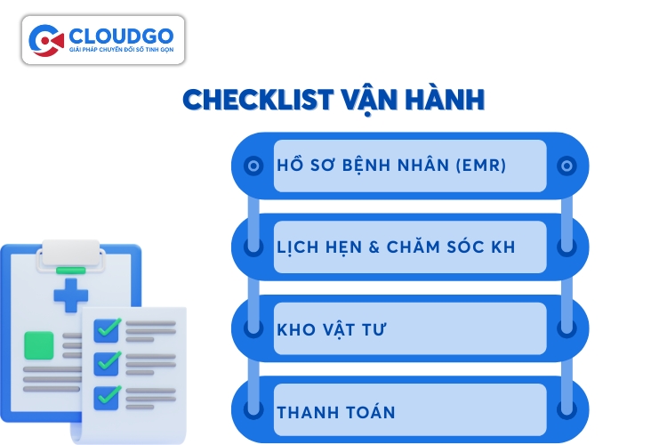 Checklist này tập trung vào việc tối ưu hóa hiệu suất công việc hàng ngày như quản lý hồ sơ bệnh nhân tập trung, quản lý lịch hẹn thông minh, kiểm soát kho vật tư chính xác…