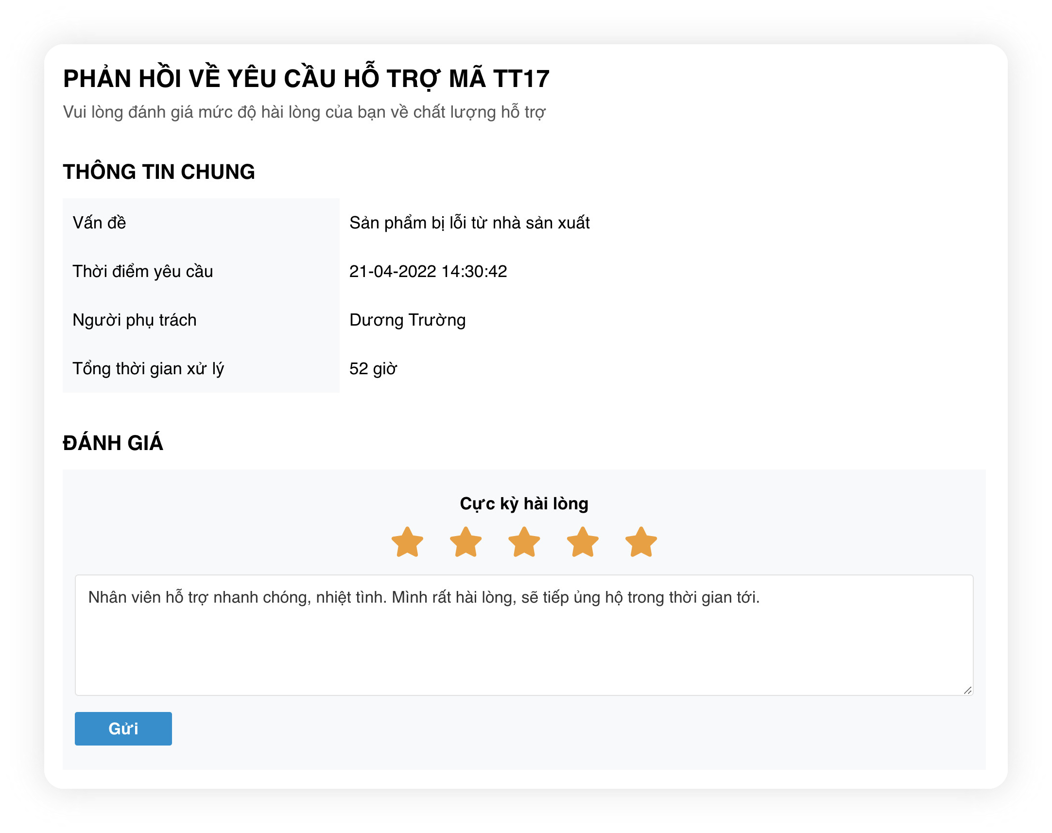 Loại bỏ hoàn toàn việc bỏ sót yêu cầu khách hàng và lãng phí thời gian điều phối thủ công. Quy trình trơn tru giúp rút ngắn tối đa thời gian xử lý sự vụ và tạo ấn tượng chuyên nghiệp.