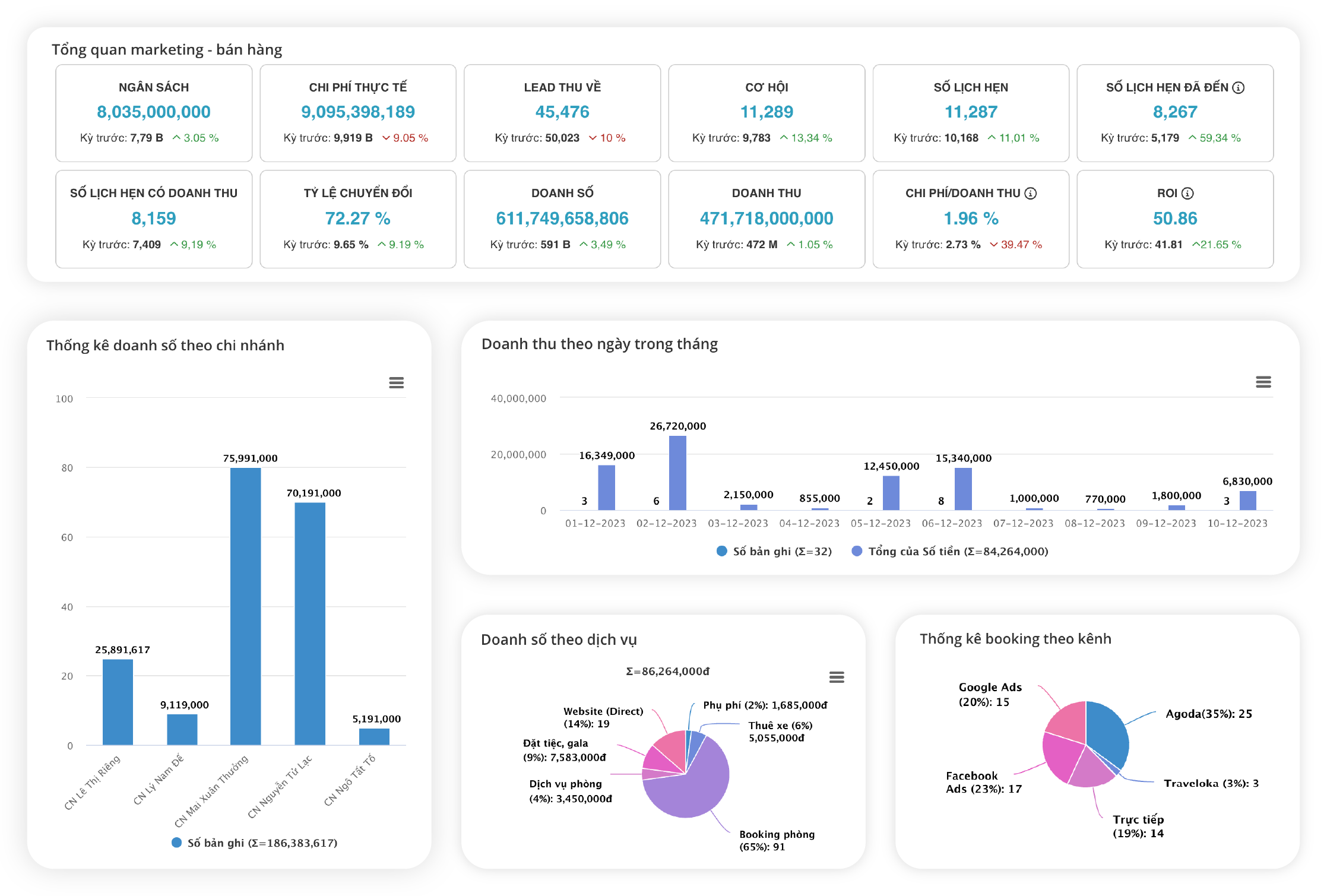 • Đo lường hiệu quả các chiến dịch quảng cáo Facebook Ads, Google Ads theo chiến dịch, theo nguồn, theo nhân viên: chi phí, số lượng data thu về, số lịch hẹn khám, số khách đến, số lịch hẹn phát sinh doanh thu, tỷ lệ chốt, doanh số, ROI…