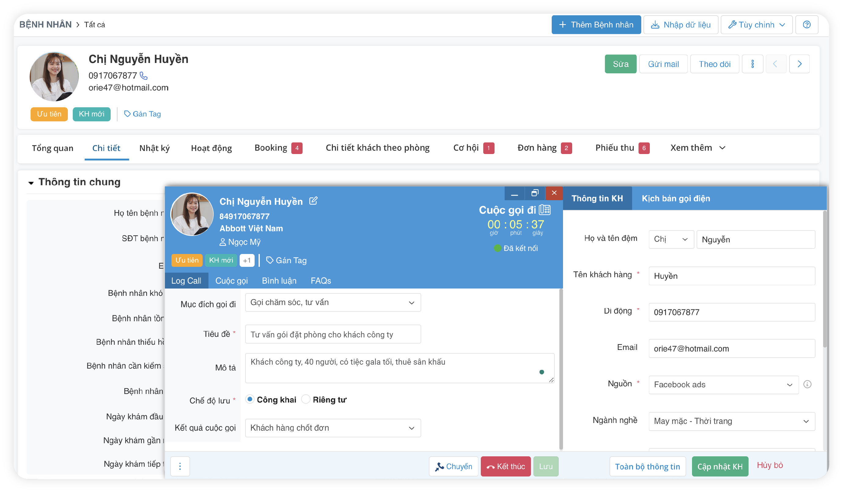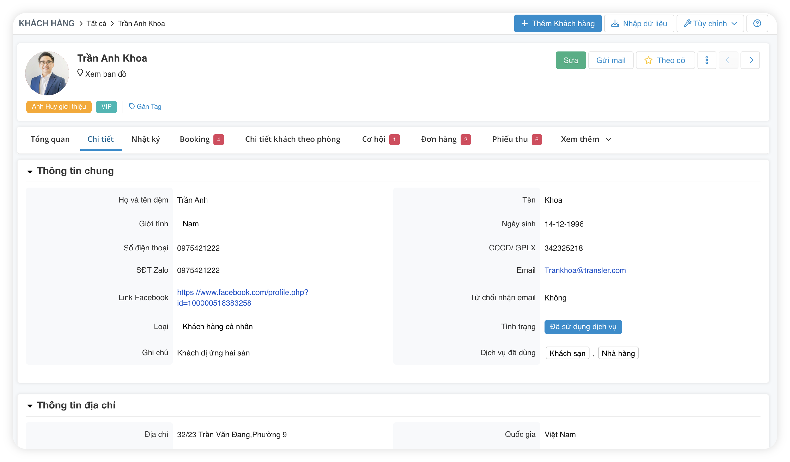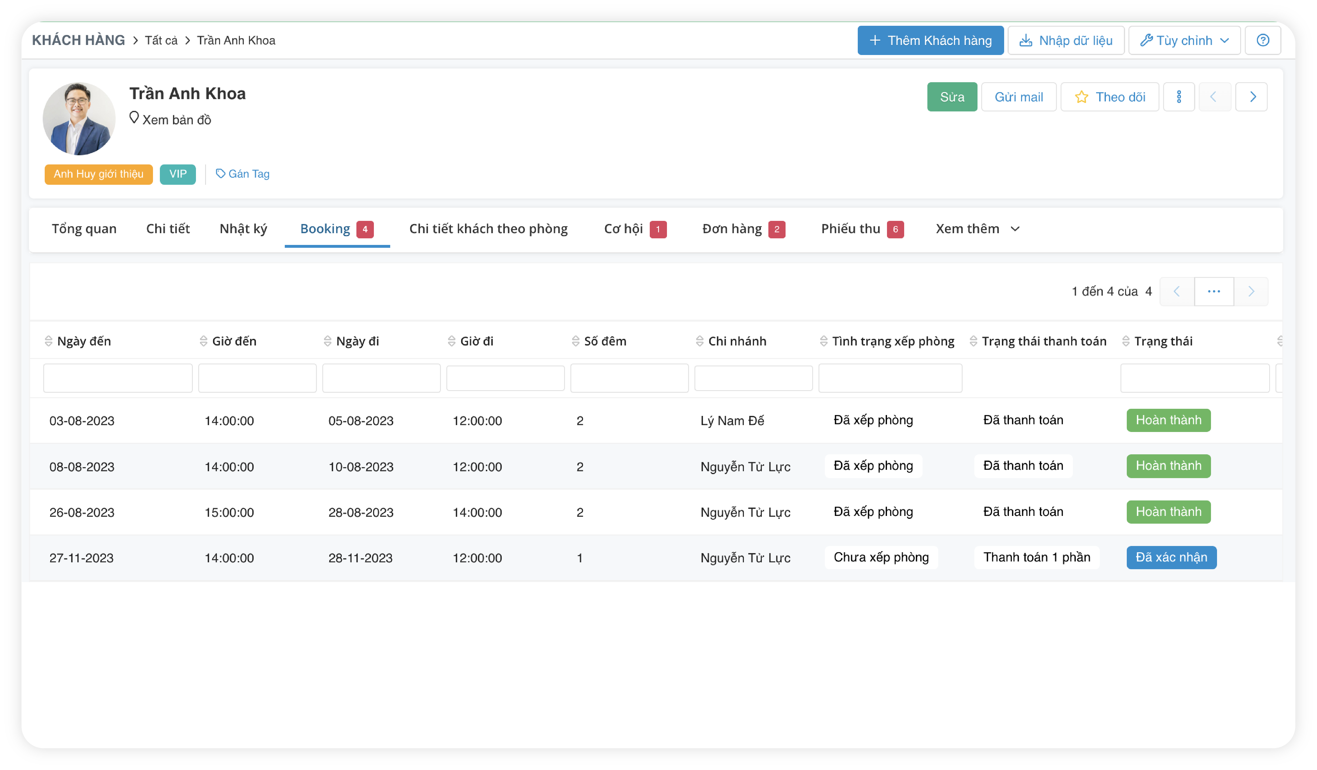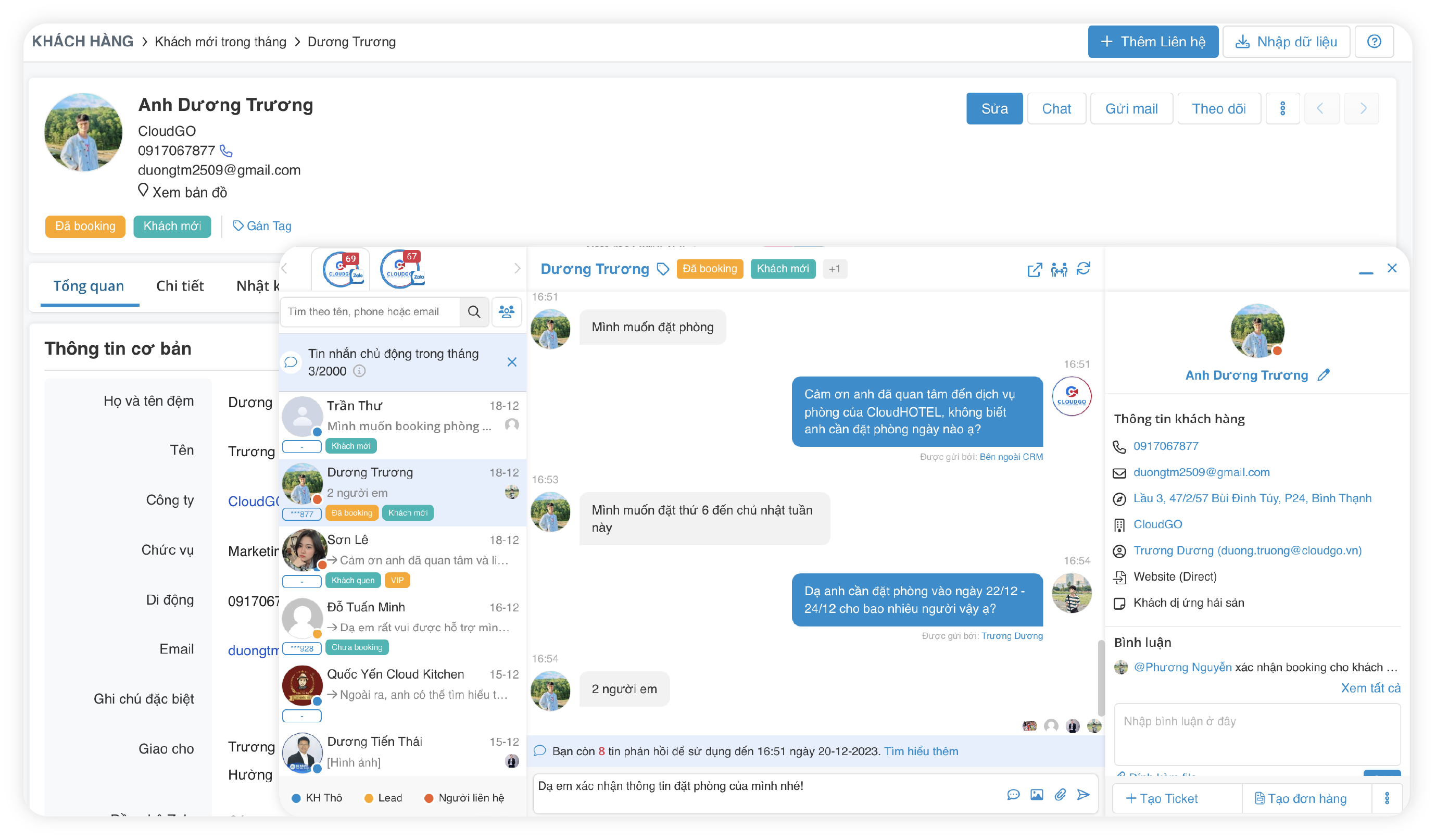 • Cung cấp góc nhìn 360 độ về khách hàng: thông tin liên hệ, lịch sử đặt phòng, lịch sử chăm sóc…
