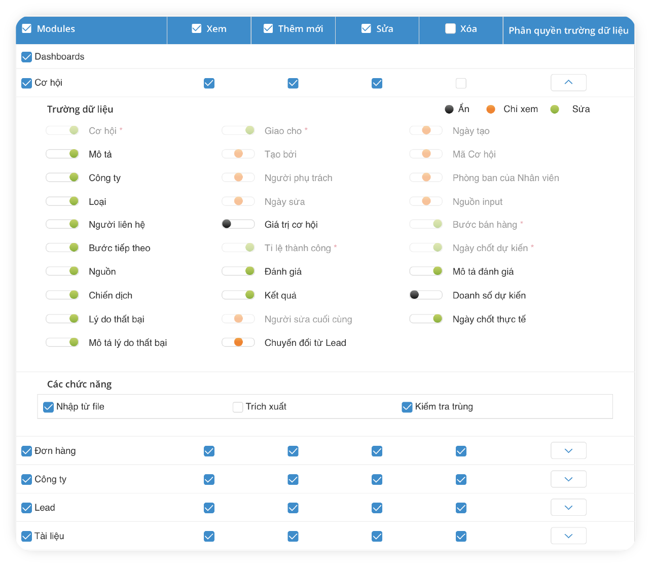Kiểm soát chi tiết quyền hạn của từng người dùng đối với dữ liệu và các thao tác nghiệp vụ trên hệ thống.