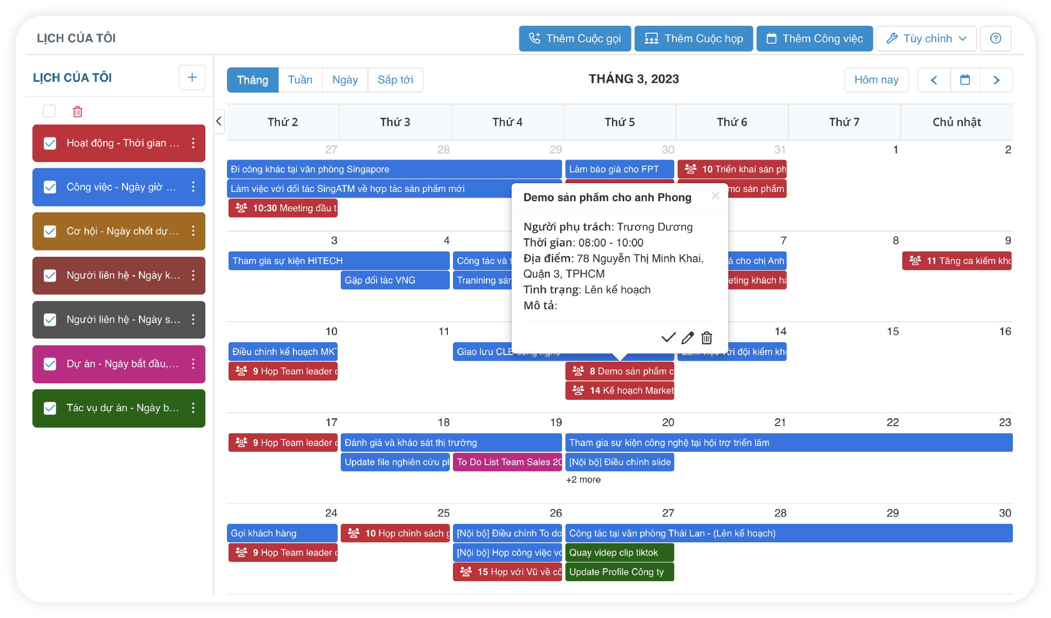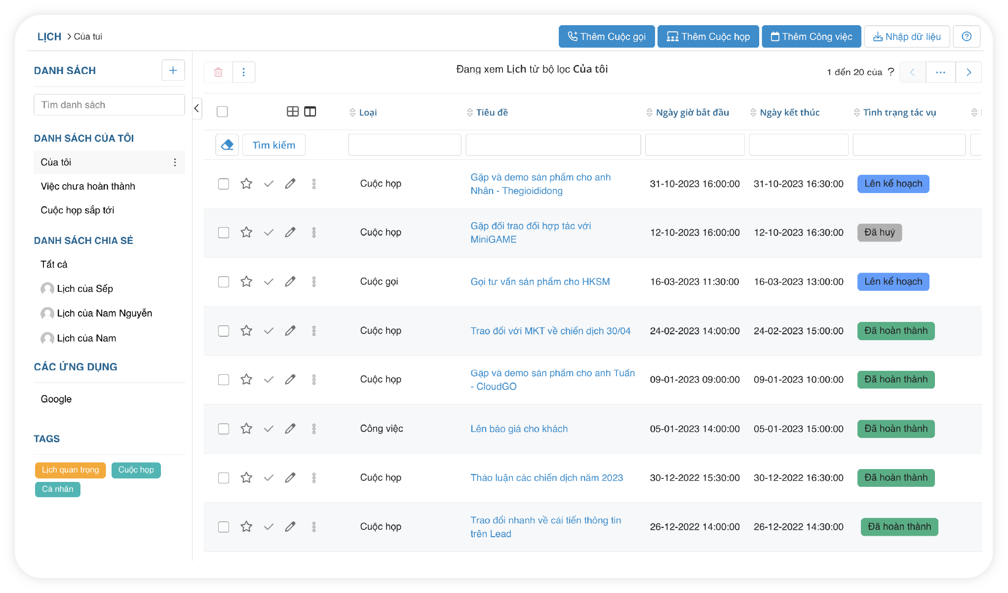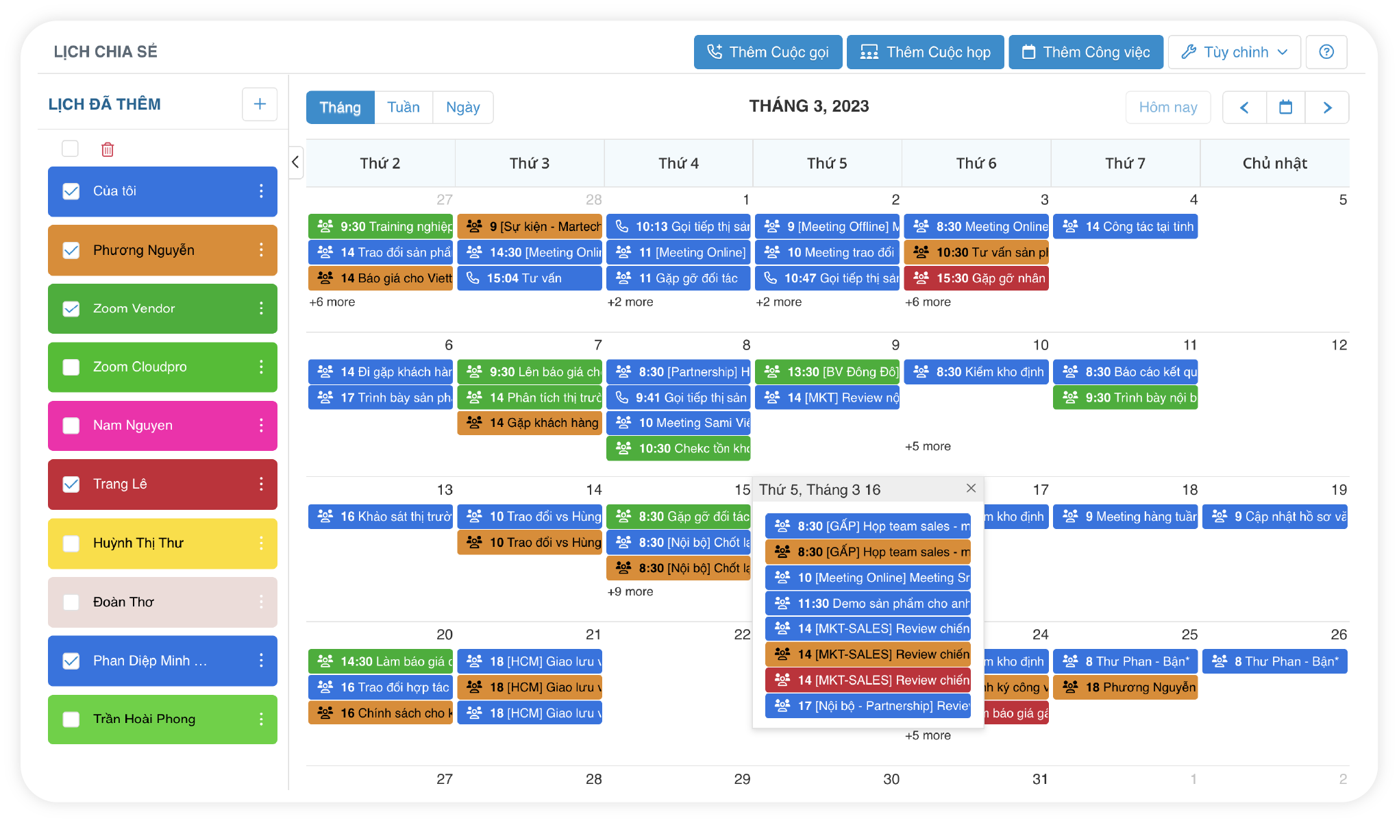 Cho phép nhân viên chủ động xây dựng lộ trình chăm sóc khách hàng và giúp cấp quản lý giám sát lịch làm việc của toàn nhóm.