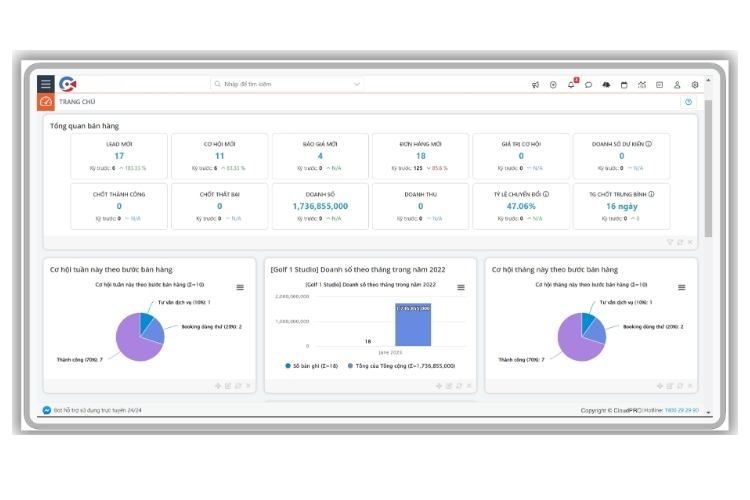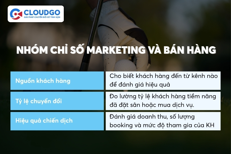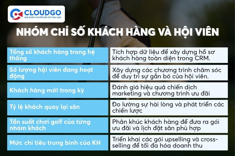 Toàn bộ các nhóm chỉ số kể trên đều có thể theo dõi tập trung trên dashboard của CloudGOLF giải pháp CRM chuyên biệt cho ngành golf từ CloudGO, được xây dựng dựa trên hơn 15 năm kinh nghiệm và 2.500 doanh nghiệp đã tin chọn. Thay vì mất thời gian tùy chỉnh từ đầu, CloudGOLF được xây dựng sẵn theo đúng nghiệp vụ ngành golf từ booking, doanh thu, hội viên đến vận hành và marketing đều có chỉ số theo dõi ngay khi hệ thống đi vào hoạt động.