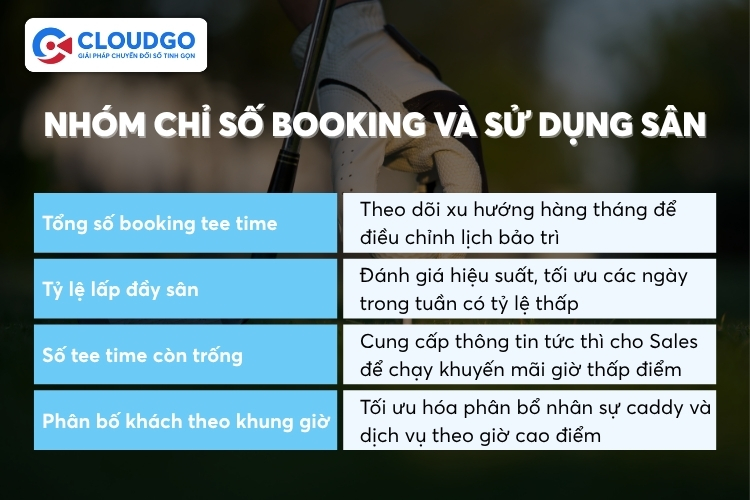 Đây là nhóm chỉ số nền tảng, cung cấp cái nhìn trực quan về mức độ sử dụng sân golf và hiệu quả khai thác tài nguyên. Quản lý các chỉ số này giúp sân golf điều chỉnh linh hoạt lịch trình và chiến lược bán hàng.