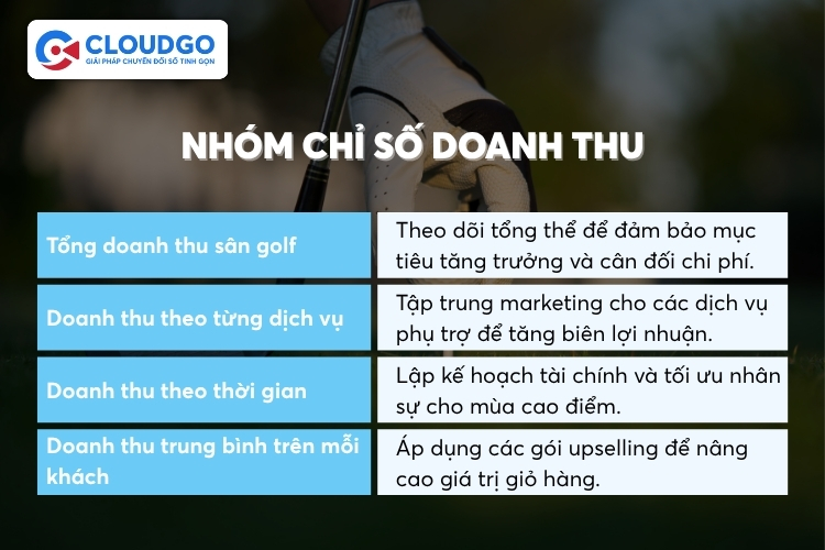 Các chỉ số doanh thu là thước đo trực tiếp cho sức khỏe tài chính và hiệu quả kinh doanh của sân golf, giúp ban quản lý đánh giá hiệu quả của từng dịch vụ.
