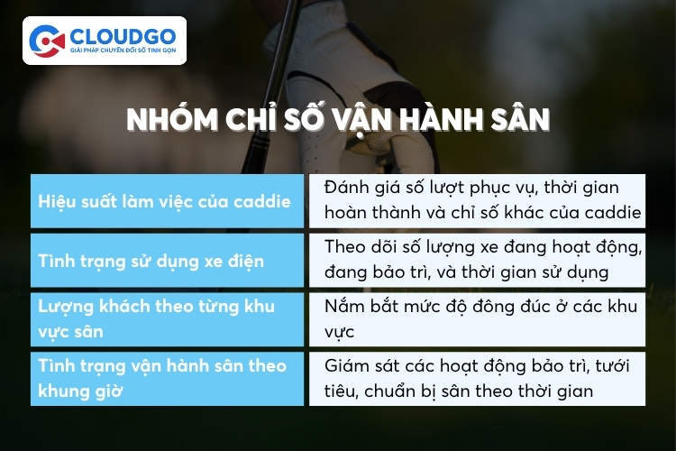 - Hiệu suất vận hành và nhân sự: Giám sát caddie, xe điện và các bộ phận vận hành theo khung giờ..