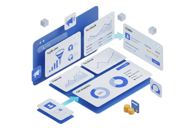 Hệ thống có 50+ mẫu báo cáo có sẵn (Tuyển sinh, Tài chính, CSKH...),khả năng tạo báo cáo động, tùy chỉnh , và Dashboard trực quan, cập nhật liên tục. Điều này giúp rút ngắn thời gian ra quyết định và tăng hiệu quả quản trị ~38%.