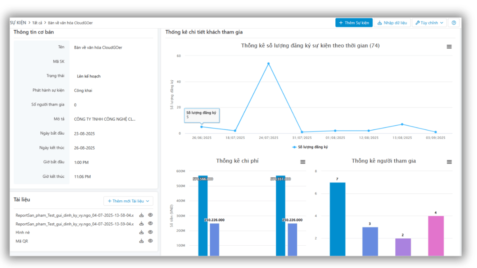 Nắm bắt toàn bộ số liệu sự kiện trong tích tắc từ lượng tin nhắn, số khách tham gia cho đến chi phí. Mọi dữ liệu được hiển thị rõ ràng, giúp bạn đánh giá hiệu quả và ra quyết định nhanh chóng.