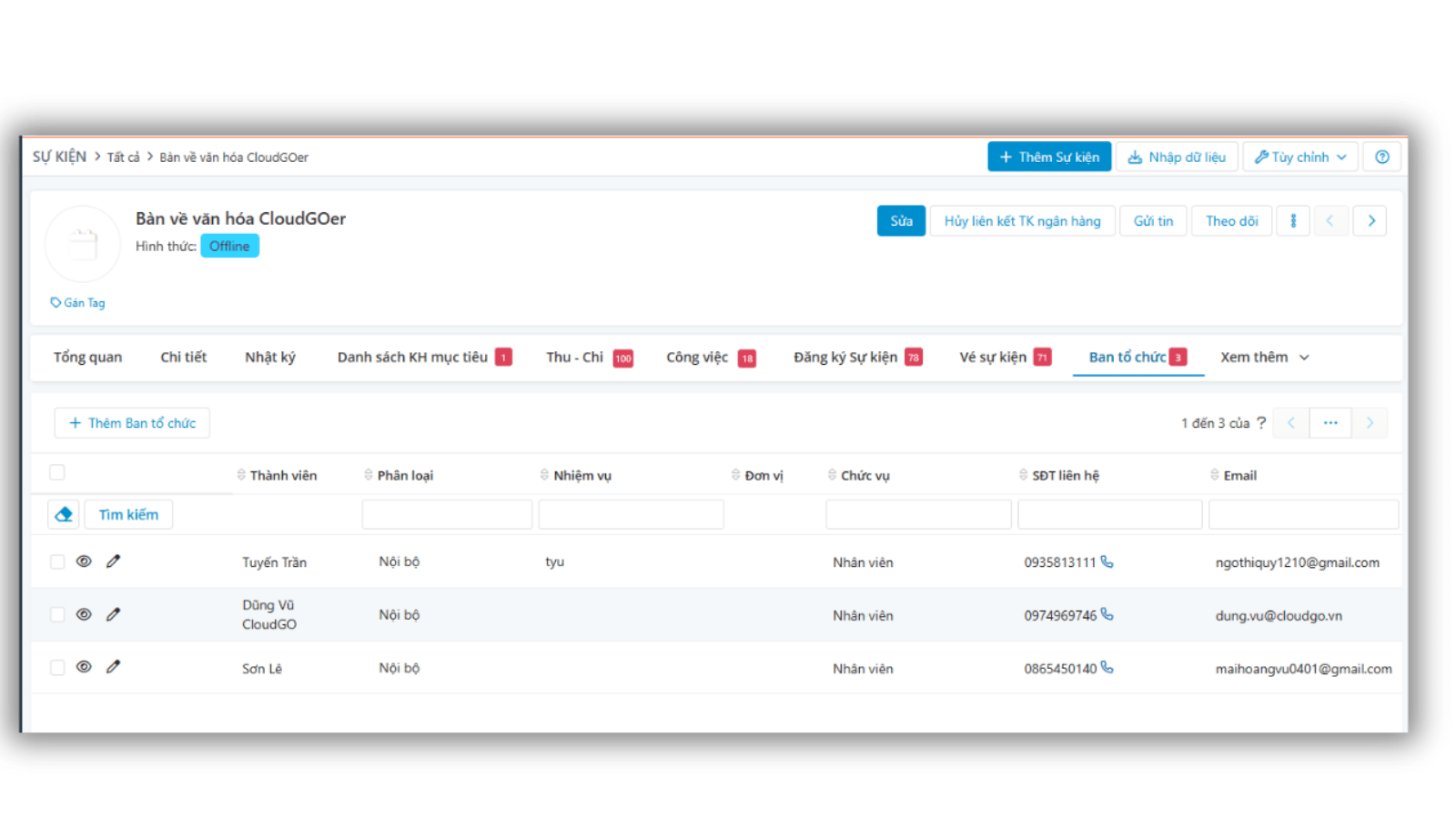 Dễ dàng tạo danh sách ban tổ chức, từ nhân sự nội bộ đến đối tác bên ngoài. Mỗi người đều có nhiệm vụ rõ ràng cùng thông tin liên hệ, giúp bạn gửi thông báo và nhắc nhở sự kiện kịp thời, đảm bảo phối hợp trơn tru.