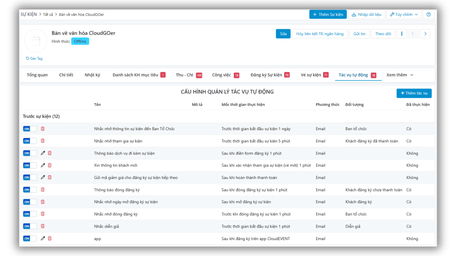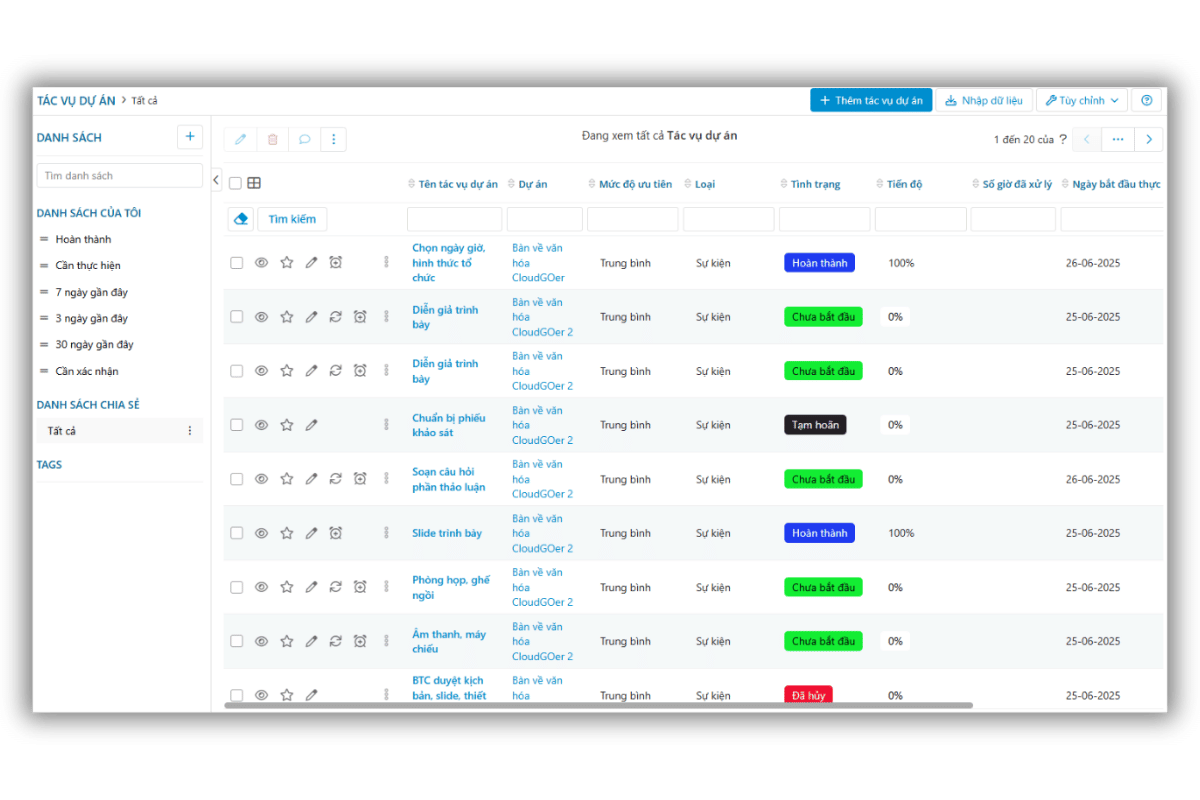 Quản lý sự kiện dễ dàng, tất cả trong một, từ việc lập kế hoạch chỉ trong vài phút, nhóm công việc thông minh theo hạng mục & mốc thời gian, cho đến giao việc – theo dõi liền mạch trên CloudWork (app & web). Mọi chi phí cũng được đồng bộ tự động, giúp bạn kiểm soát tài chính sự kiện minh bạch và chính xác tuyệt đối.