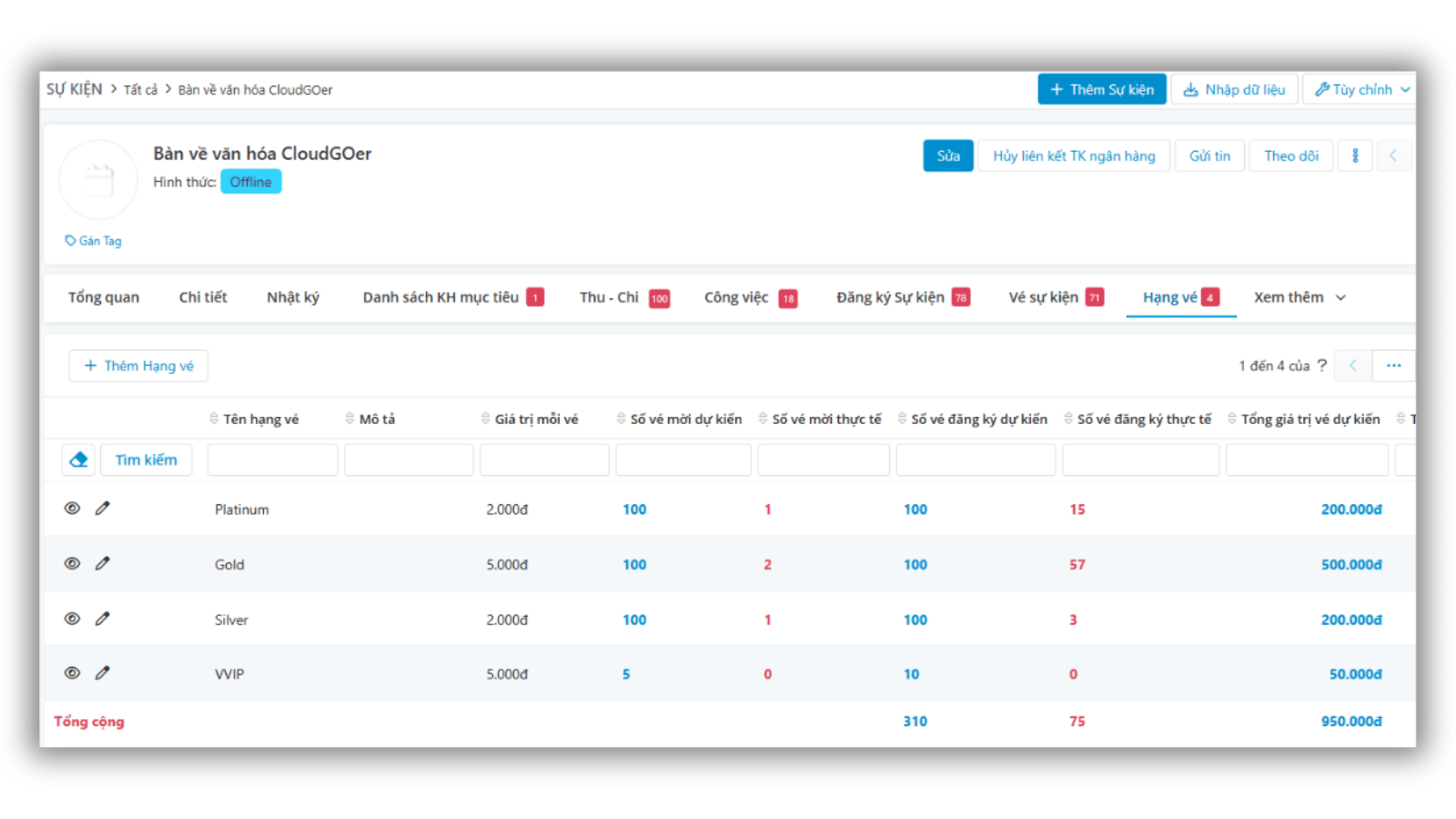 Định nghĩa dễ dàng các hạng vé với giá trị và số lượng cụ thể. Khi người tham dự đăng ký và mua vé, hệ thống sẽ tự động cập nhật số lượng còn lại, giúp bạn kiểm soát bán vé minh bạch và tối ưu doanh thu.