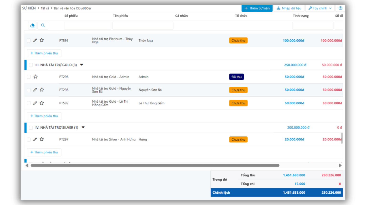 Xây dựng danh mục tài trợ linh hoạt (Kim cương, Vàng, Teabreak…) với giá trị rõ ràng cho từng suất. Mọi nhà tài trợ đều được quản lý tập trung trong một tab riêng, liên kết trực tiếp với thu/chi sự kiện. Bạn còn có thể theo dõi trạng thái tài trợ theo thời gian thực – từ chuyển tiền đến bàn giao hiện vật – đảm bảo cam kết được thực hiện đầy đủ và minh bạch.