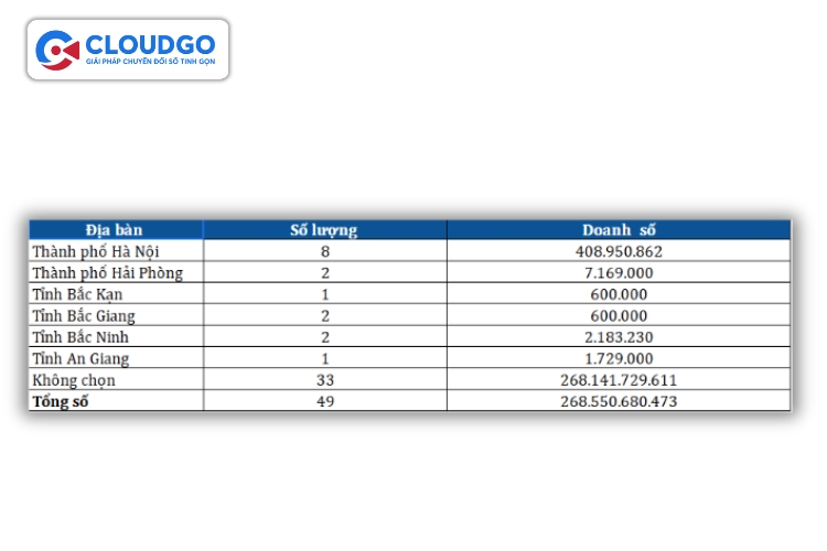 Báo cáo doanh thu theo khu vực giúp đánh giá hiệu quả kinh doanh ở từng vùng, nhận diện thị trường tiềm năng và khu vực cần cải thiện. Báo cáo này hỗ trợ phòng Kinh doanh phân bổ nguồn lực hợp lý, điều chỉnh chiến lược marketing, lập kế hoạch mở rộng thị trường và thúc đẩy doanh số ở các khu vực trọng điểm.