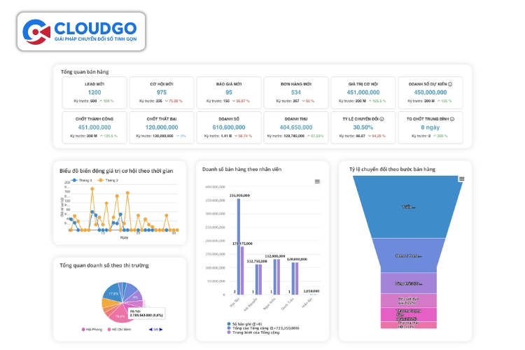 Như chúng ta đã thấy, việc dùng mẫu báo cáo doanh thu bằng Excel tuy tiện lợi ban đầu nhưng lại tiềm ẩn nhiều vấn đề nghiêm trọng khi doanh nghiệp mở rộng quy mô. CloudGO hiểu rõ những thách thức này và mang đến giải pháp CloudSALE – phần mềm CRM (Quản lý Quan hệ Khách hàng) được thiết kế đặc biệt để giúp phòng Kinh doanh giải quyết triệt để các vấn đề trên, mang lại hệ thống báo cáo nhanh chóng, trực quan và chính xác: