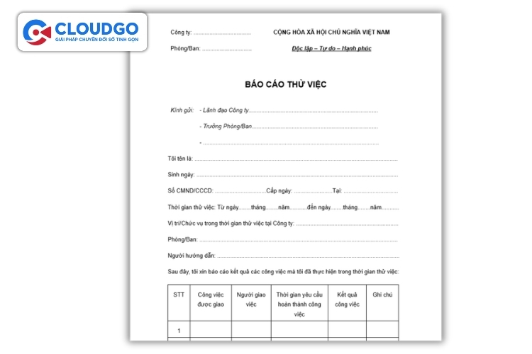 8 Hạng mục trên là khung nội dung tối thiểu để một báo cáo thử việc có giá trị thực sự. Điền tay từng phần tốn thời gian đó là lý do các mẫu có sẵn bên dưới được thiết kế để doanh nghiệp điền vào và dùng ngay. Doanh nghiệp sử dụng CloudWORK có thể xuất trực tiếp báo cáo KPI cá nhân từ hệ thống số liệu minh chứng khách quan nhất để điền vào phần này, không cần tổng hợp thủ công."