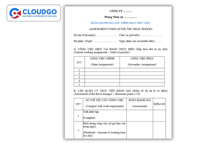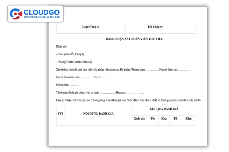 Để giúp doanh nghiệp có cái nhìn toàn diện và đưa ra quyết định nhân sự chính xác, CloudGO đã tổng hợp và xây dựng các mẫu đánh giá nhân viên thử việc tiêu chuẩn, tuân thủ Bộ luật Lao động 2019. Các mẫu này được thiết kế linh hoạt, phù hợp với nhiều ngành nghề và quy mô doanh nghiệp, đặc biệt là các SME cần sự nhanh chóng và hiệu quả. Dưới đây là các mẫu phổ biến mà bạn có thể tải về và áp dụng ngay:
