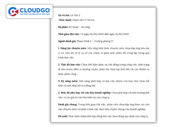 Mẫu đánh giá nhân viên thử việc chưa đạt yêu cầu