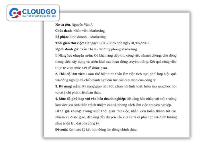 Đánh giá nhân viên thử việc đạt yêu cầu (có đề xuất ký HĐLĐ)