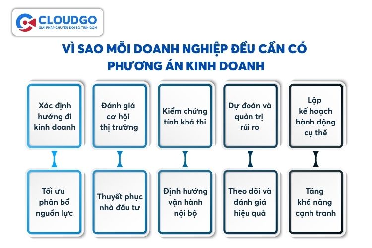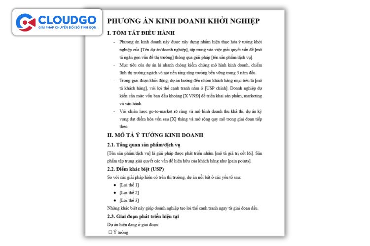 Việc xây dựng một phương án kinh doanh từ đầu có thể tốn nhiều thời gian và công sức, đặc biệt với các doanh nghiệp SME chưa có nhiều kinh nghiệm. Để giúp bạn tiết kiệm thời gian và đảm bảo có một bản kế hoạch đầy đủ, chuyên nghiệp, CloudGO đã tổng hợp và chia sẻ 4 mẫu phương án kinh doanh phổ biến nhất, phù hợp với nhiều mục đích khác nhau của doanh nghiệp Việt. Hãy cùng tìm hiểu và tải về để bắt đầu lập kế hoạch ngay hôm nay!