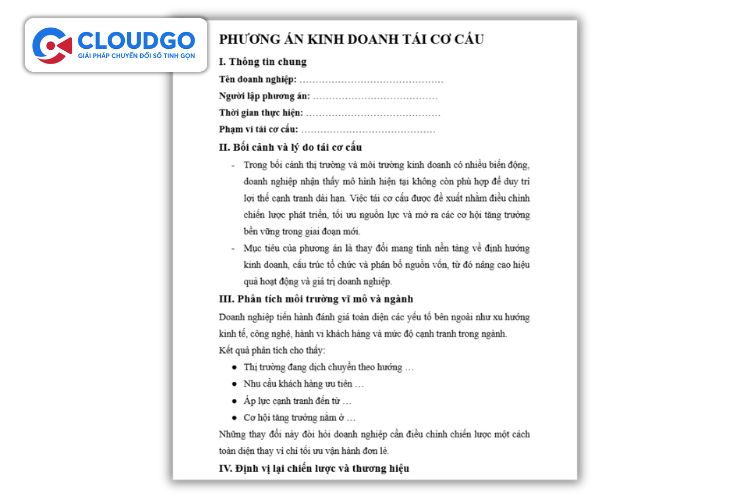 Phương án kinh doanh tái cơ cấu thường mang tính chiến lược và toàn diện hơn, áp dụng khi doanh nghiệp cần thay đổi căn bản về mô hình kinh doanh, định hướng chiến lược hoặc thậm chí là cấu trúc sở hữu. Mục đích có thể là để thích nghi với sự thay đổi của thị trường, tìm kiếm hướng đi mới hoặc sáp nhập/mua lại. Mẫu này sẽ tập trung vào phân tích môi trường vĩ mô, định vị lại thương hiệu, chiến lược phát triển sản phẩm/dịch vụ cốt lõi, cơ cấu lại tài sản và nguồn vốn, cũng như các kế hoạch chuyển đổi văn hóa doanh nghiệp. Nó khác biệt ở tầm nhìn dài hạn và sự thay đổi sâu rộng hơn so với tái cấu trúc.