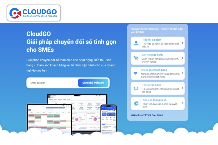 - Giải pháp phần mềm "may đo": CloudGO cung cấp các giải pháp phần mềm CRM, quản trị công việc và SaaS tùy chỉnh, được thiết kế riêng biệt để phù hợp với đặc thù từng ngành nghề và quy mô SME Việt Nam (như phân phối, sản xuất, logistics, dịch vụ, agency, bất động sản B2B…). Chúng tôi không áp dụng giải pháp đóng gói sẵn mà tập trung vào khả năng triển khai nhanh, mức độ tùy biến cao, hỗ trợ tận tâm và chi phí hợp lý.