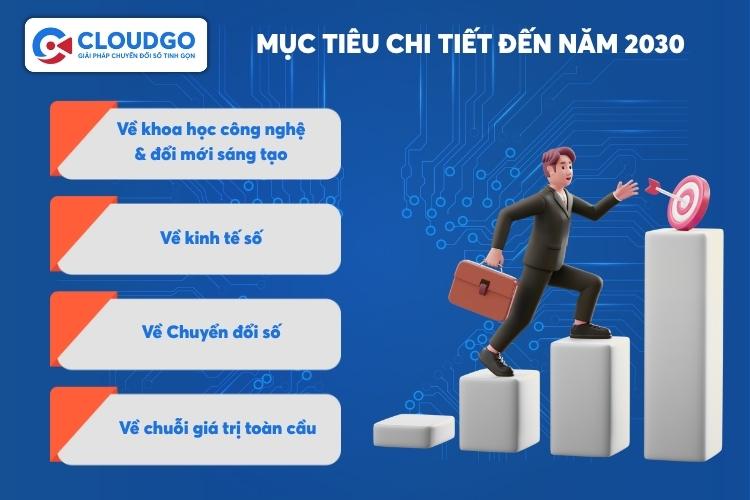 - Về Chuyển đổi số: Hướng tới đưa Việt Nam vào nhóm các nước dẫn đầu ASEAN về Chính phủ số, Kinh tế số và Xã hội số, với các dịch vụ công trực tuyến được cung cấp toàn diện, dữ liệu số được chia sẻ rộng rãi, và tỷ lệ người dân sử dụng dịch vụ số tăng cao.