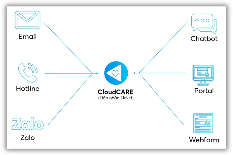 - Tiếp nhận ticket đa kênh chức năng tiếp nhận ticket đa dạng từ nhiều kênh như email, tổng đài, chatbot, Zalo OA… giúp doanh nghiệp kiểm soát và xử lý tốt phản hồi của khách hàng.