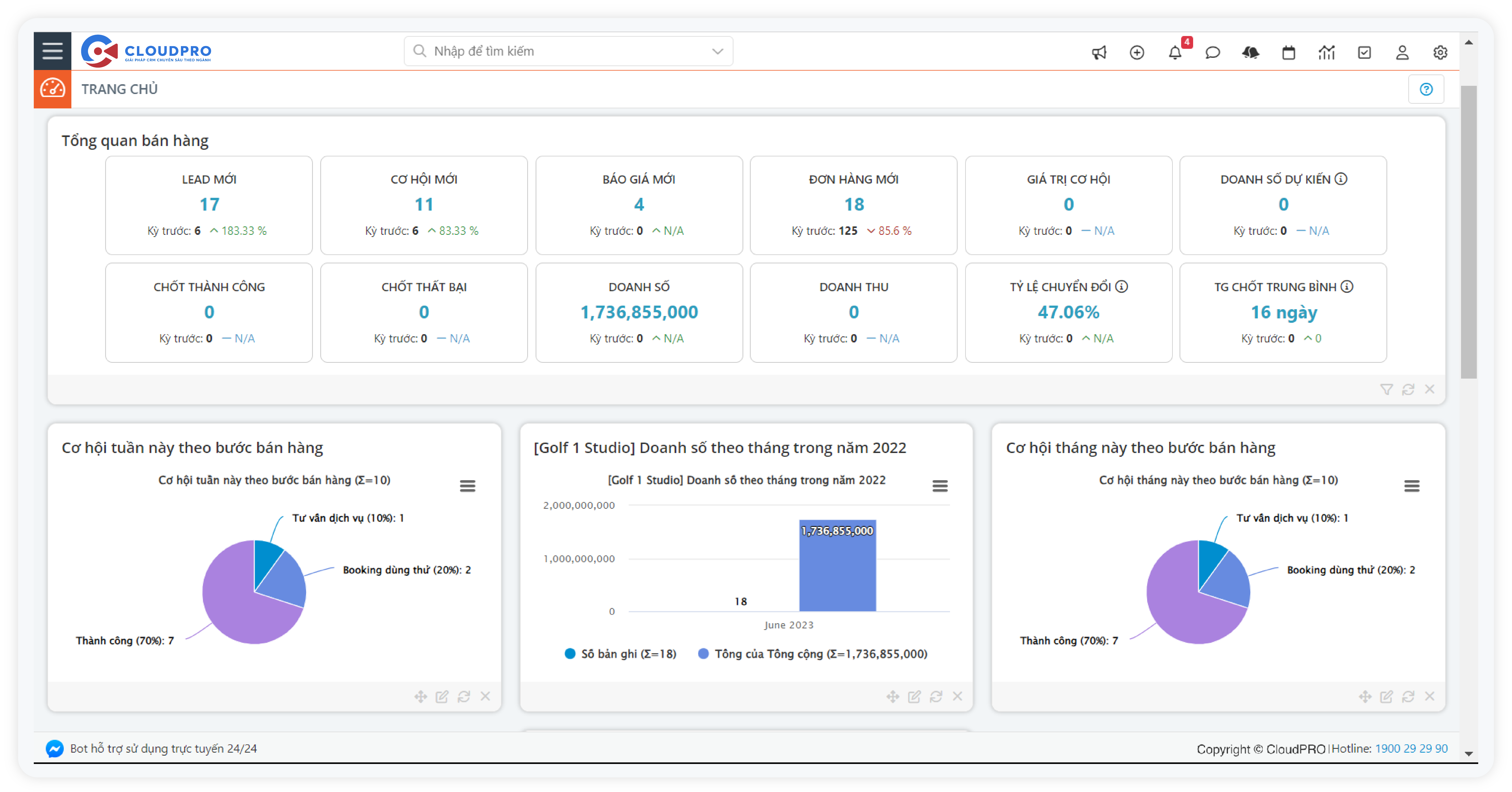 Màn hình trang chủ theo dõi tình hình hoạt động của doanh nghiệp trên CloudGOLF