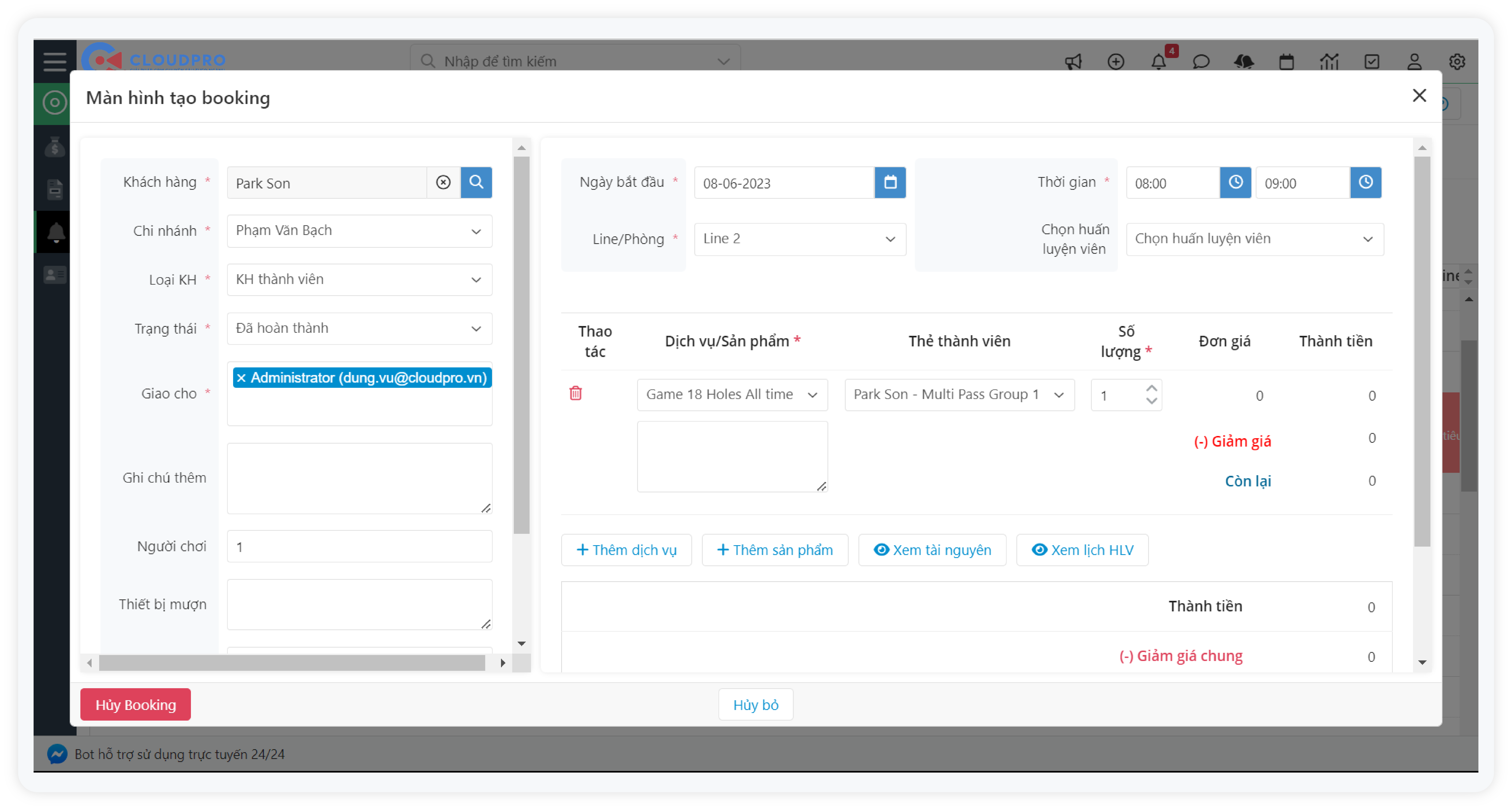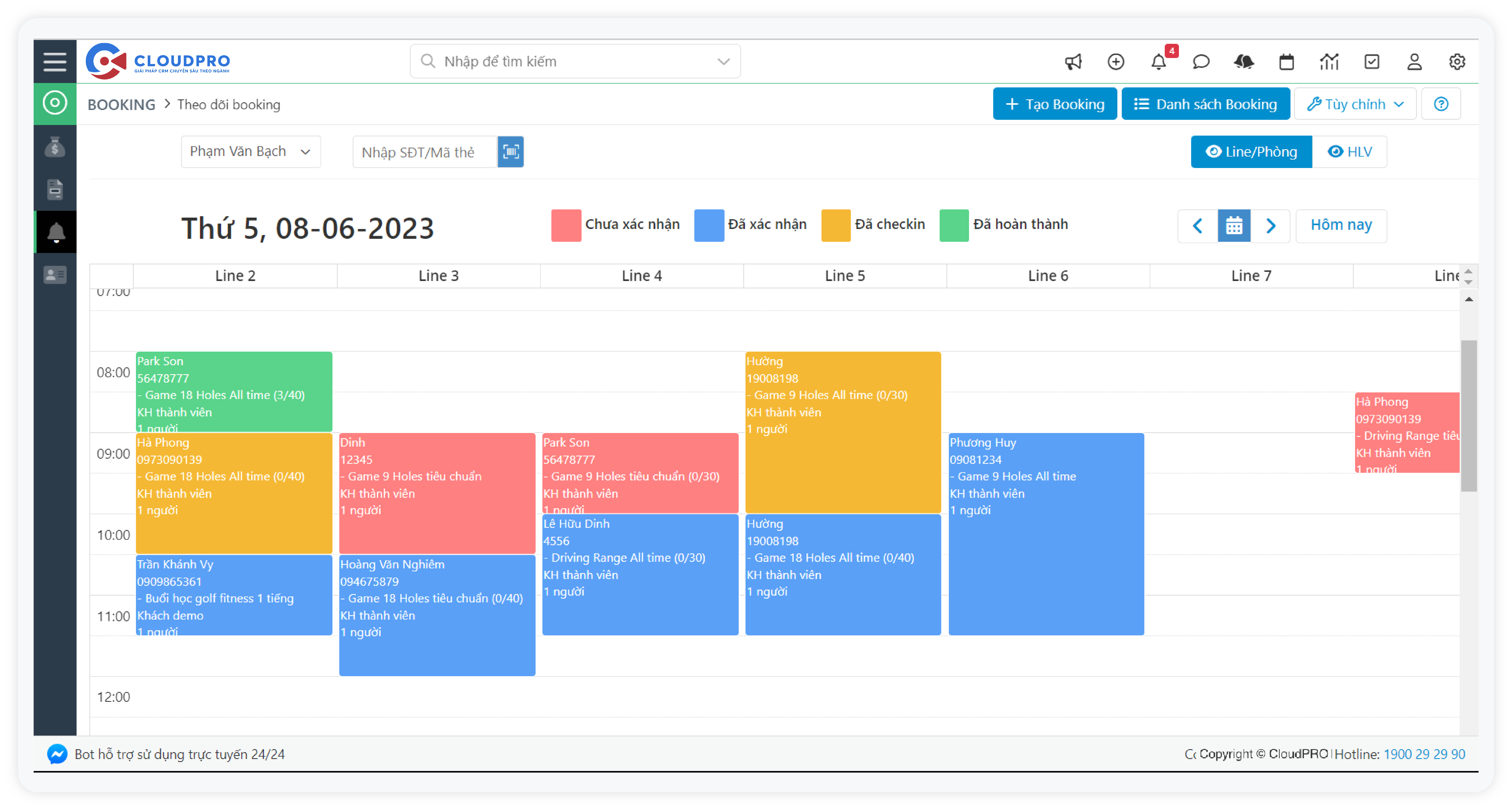 Ghi nhận và theo dõi lịch chơi thử, lịch lập của khách hàng mới, hội viên: dịch vụ, ngày giờ chơi, line/phòng, khu vực, chi nhánh, số người chơi…
