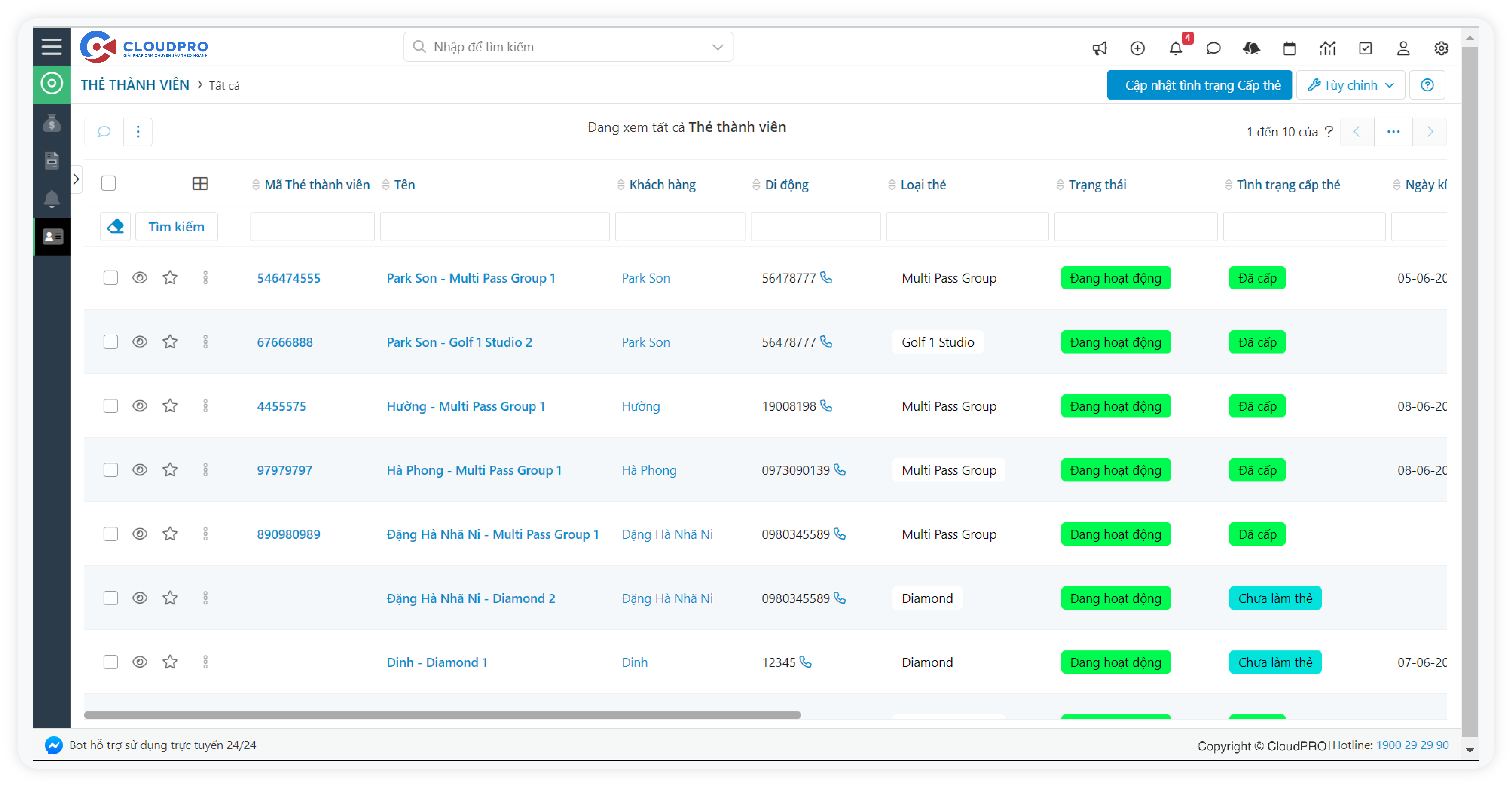 Ghi nhận và theo dõi danh sách thẻ thành viên đang hoạt động, sắp hết hạn, đã hết hạn của câu lạc bộ