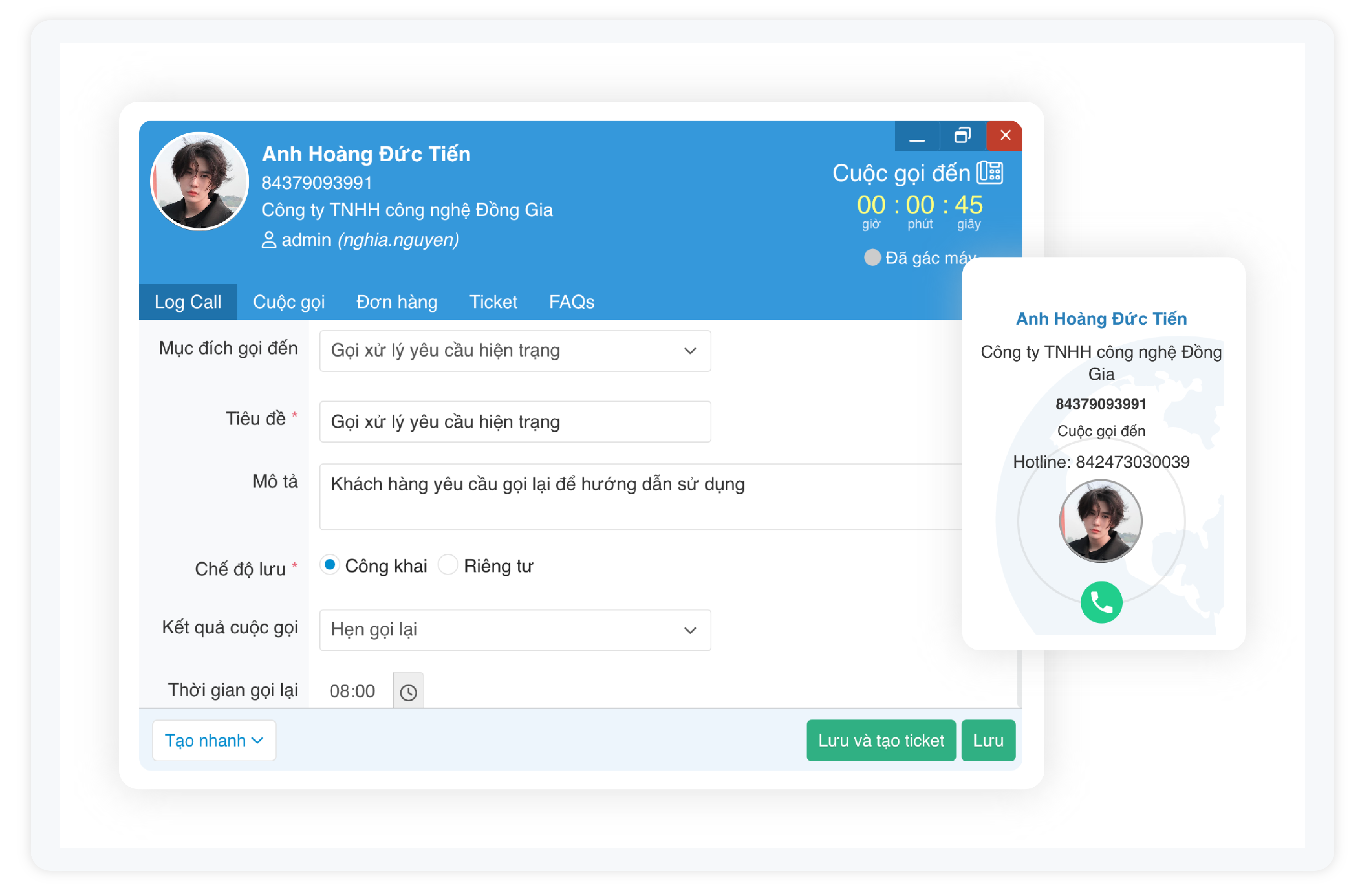 Tích hợp tổng đài call center hỗ trợ thực hiện cuộc gọi tương tác, chăm sóc khách hàng