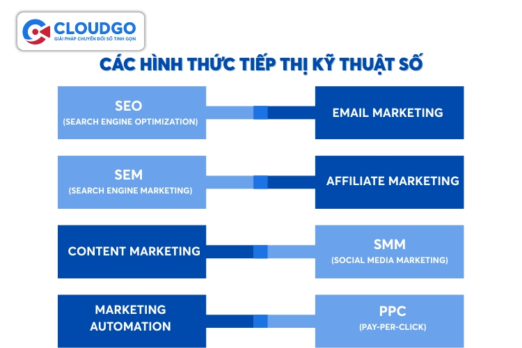 Trong lĩnh vực tiếp thị kỹ thuật số, doanh nghiệp có thể được triển khai bằng rất nhiều kênh và hình thức khác nhau. Mỗi hình thức có một ưu điểm riêng và thường được kết hợp với nhau để tạo nên một chiến lược tổng thể. Dưới đây là các hình thức phổ biến nhất mà doanh nghiệp cần nắm rõ.
