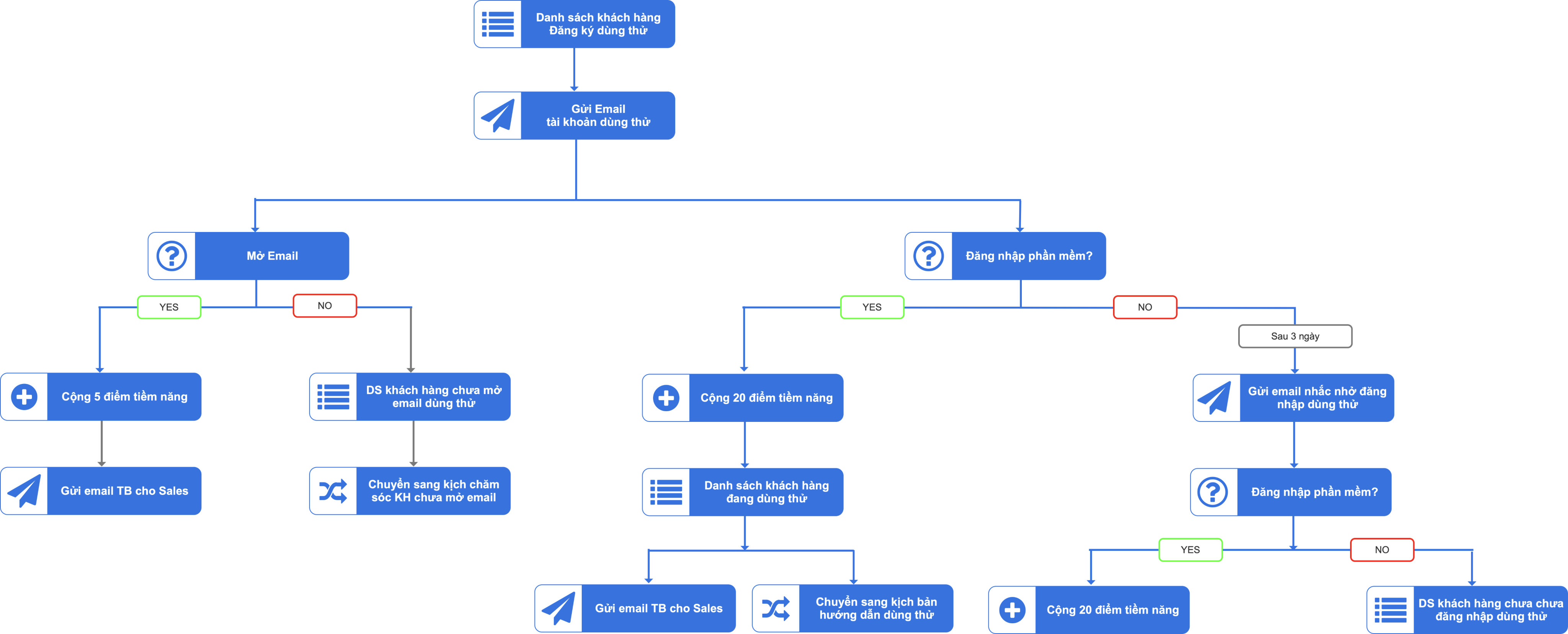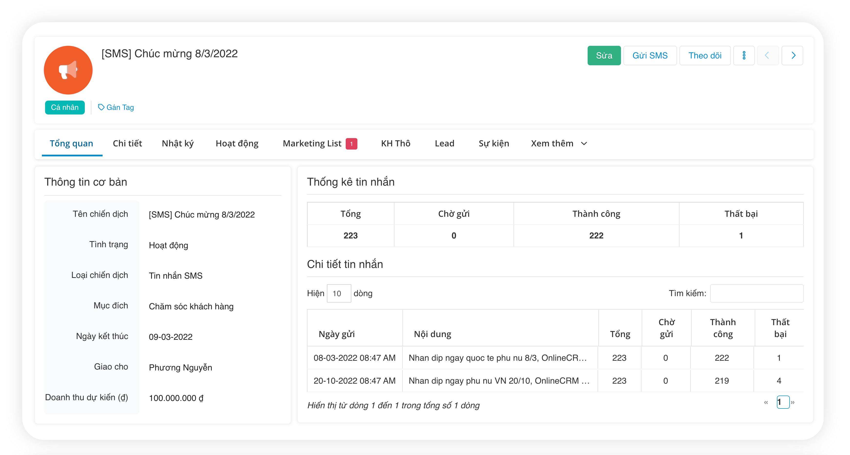 • Gửi email, SMS, Zalo ZNS theo kịch bản/chiến dịch có sẵn.