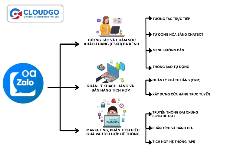 Để đảm bảo hiệu quả kinh doanh và mở rộng khả năng vận hành, Zalo OA cung cấp các tính năng mạnh mẽ về truyền thông và kết nối kỹ thuật: