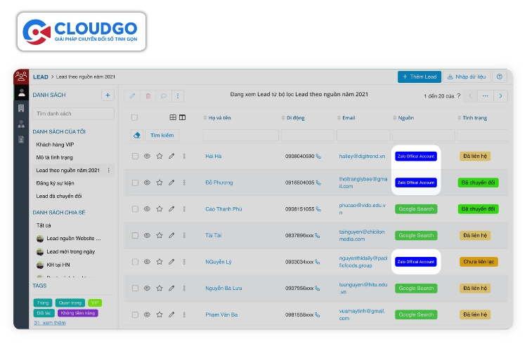 Với CloudGO, doanh nghiệp không chỉ có một phần mềm CRM thông thường — bạn còn được tích hợp Zalo OA trực tiếp vào hệ thống quản lý khách hàng. Điều này có nghĩa mọi thông tin từ kênh Zalo như khách hàng quan tâm, tin nhắn, phản hồi hay tương tác đều được đồng bộ ngay vào CRM. Nhờ vậy, bạn có thể quản lý tất cả khách hàng từ một “bảng điều khiển” duy nhất, không cần chuyển đổi giữa nhiều ứng dụng, giúp tiết kiệm thời gian và tránh sai sót dữ liệu.
